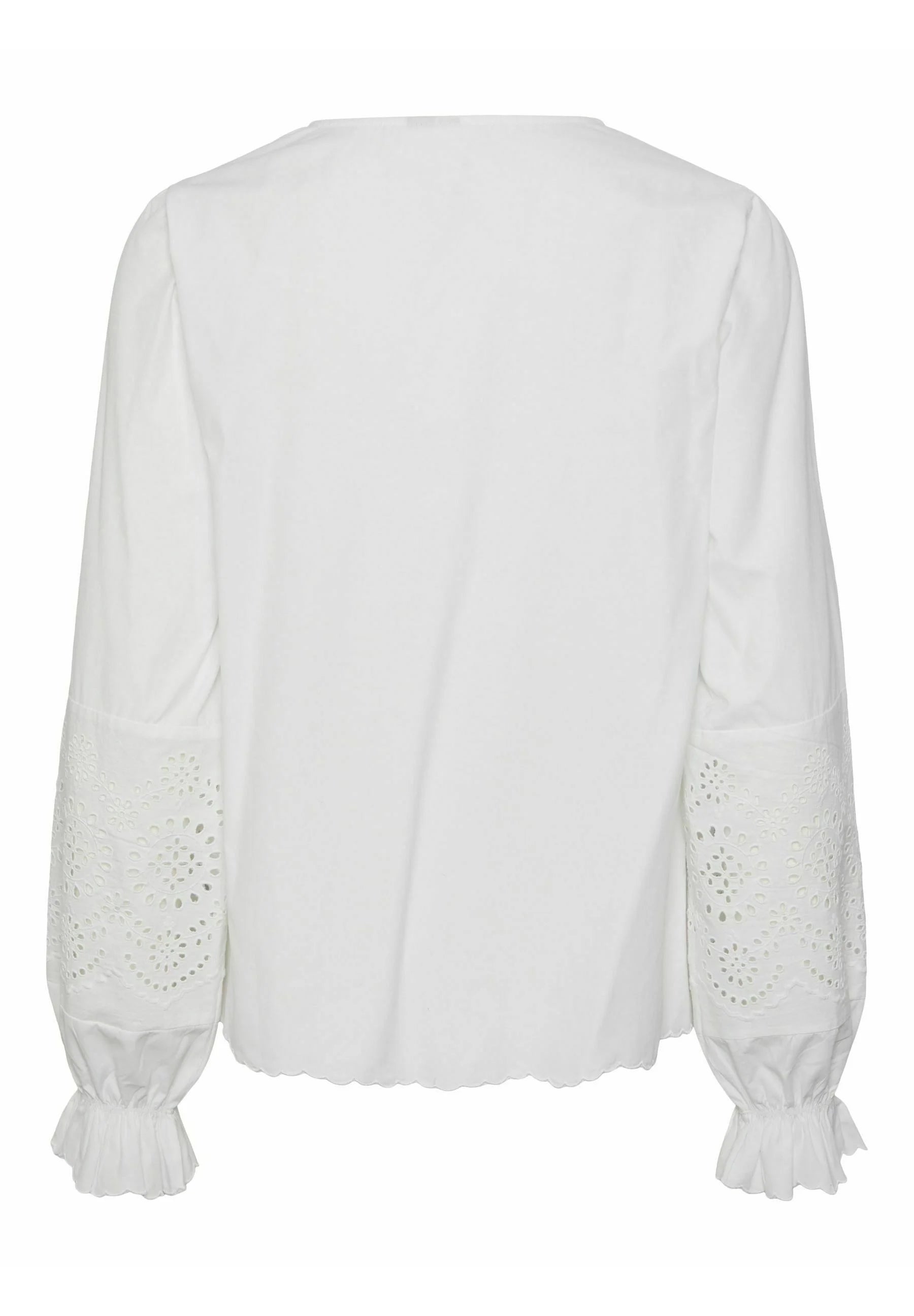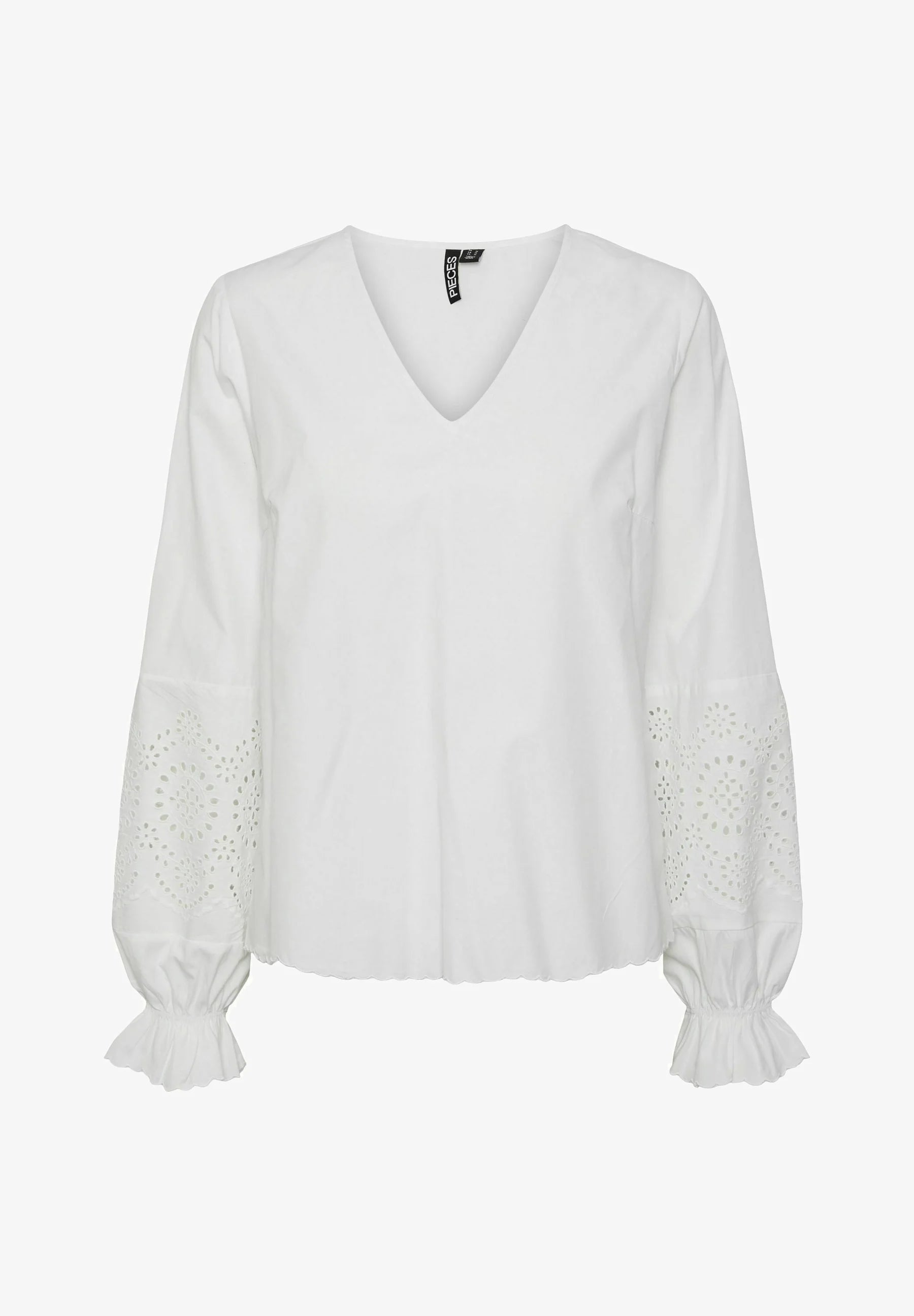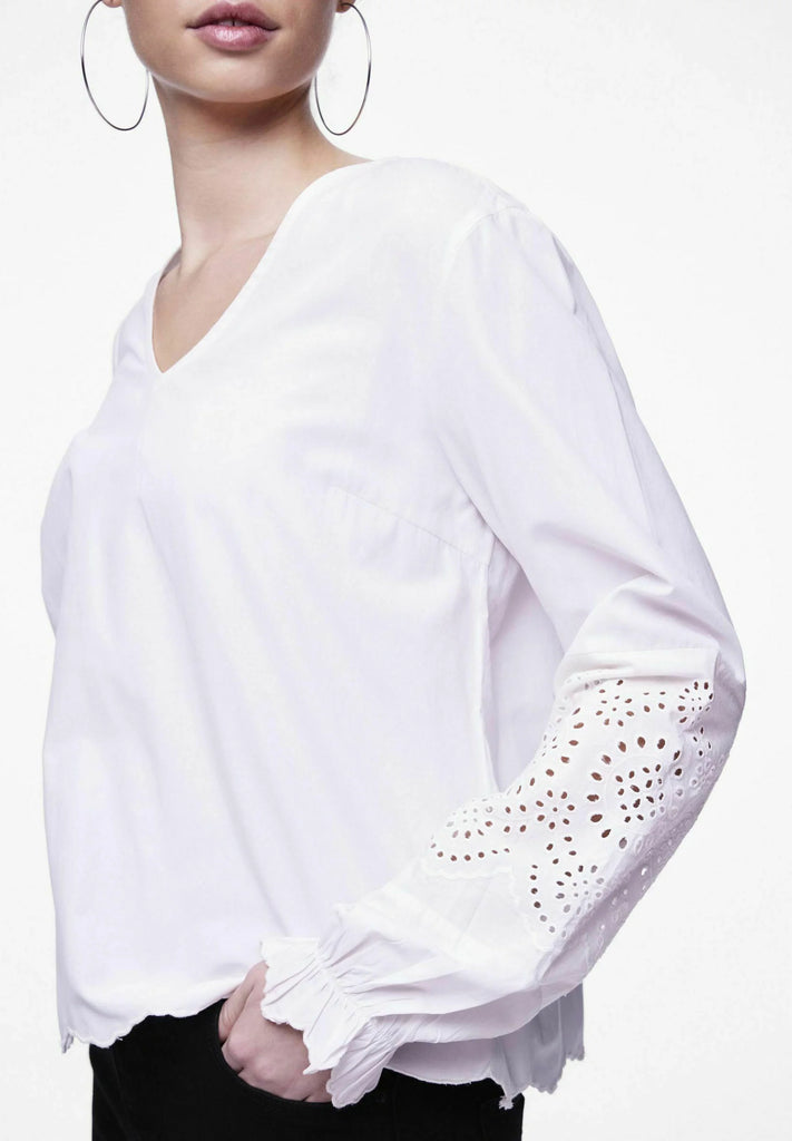 Sød bluse fra Pieces med v-hals. Er detaljeret med fin broderi anglaise ved ærmerne og frynse effekt ved håndledsafslutning.
