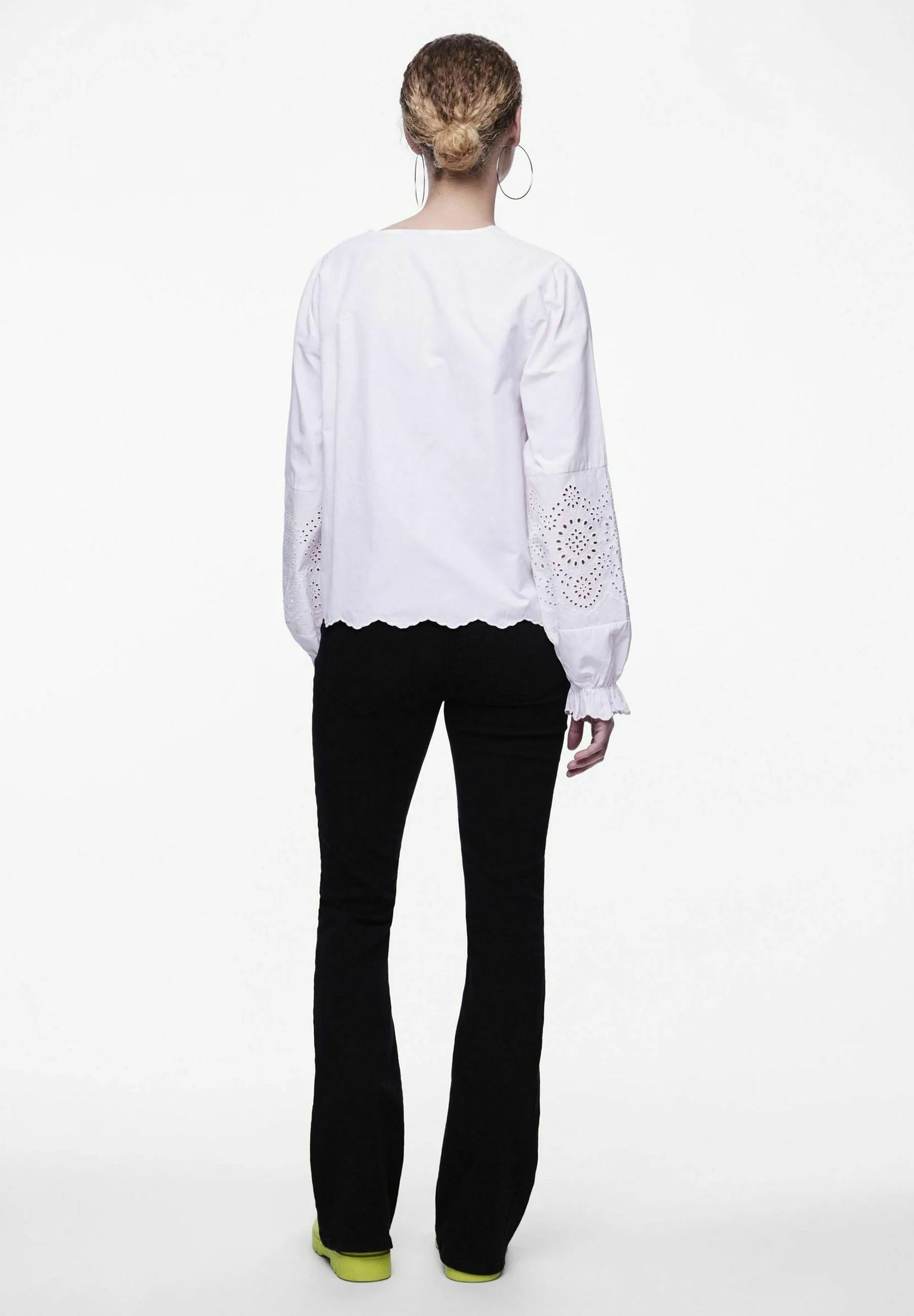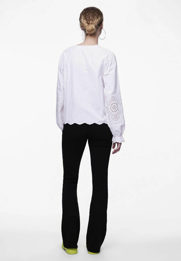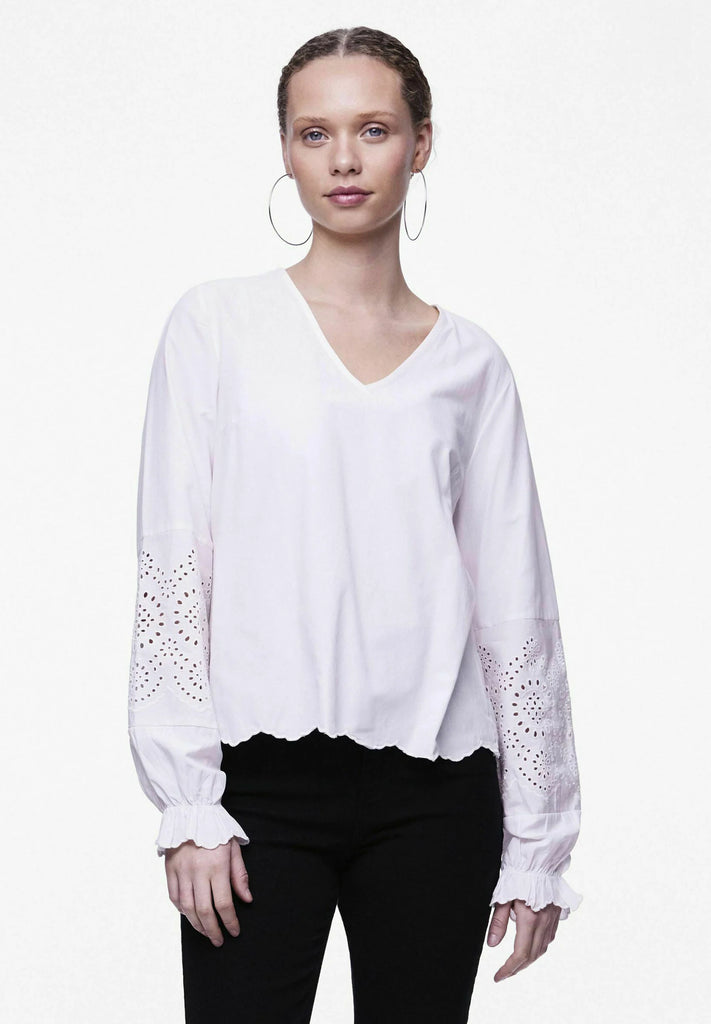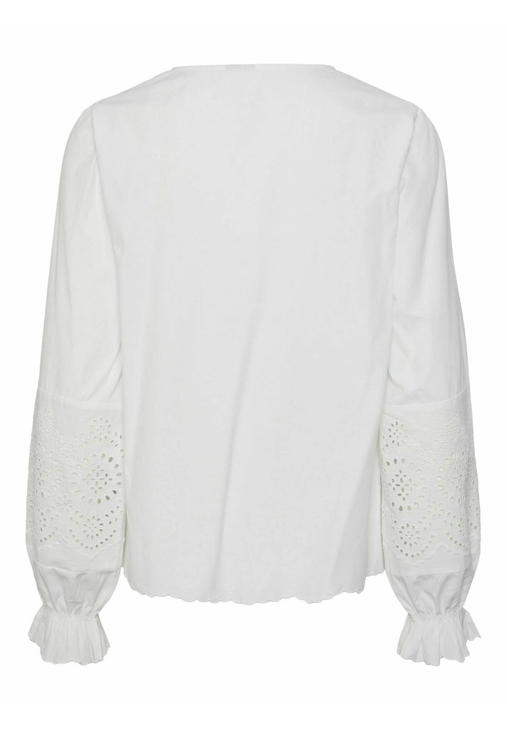 Sød bluse fra Pieces med v-hals. Er detaljeret med fin broderi anglaise ved ærmerne og frynse effekt ved håndledsafslutning.
