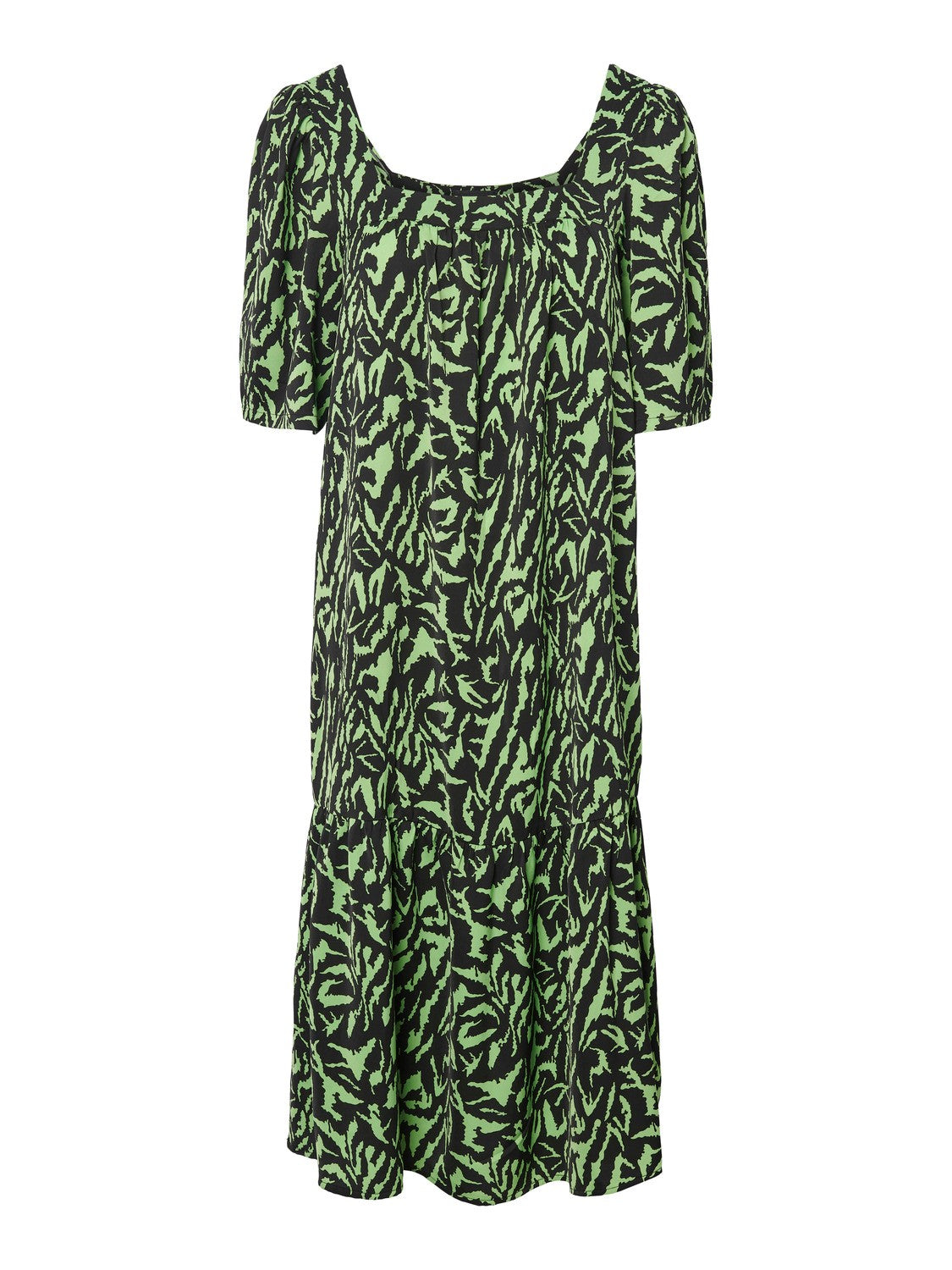 Skøn kjole fra Pieces i den fineste farvekombination af grøn og sort. Kjolen har korte ærmer og firkantet udskæring.