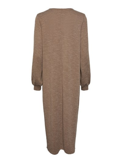 Cool kjole fra danske Pieces i en skøn mørk beige farve. Kjolen er i en lækker rib-kvalitet med v-udskæring og lange ærmer.