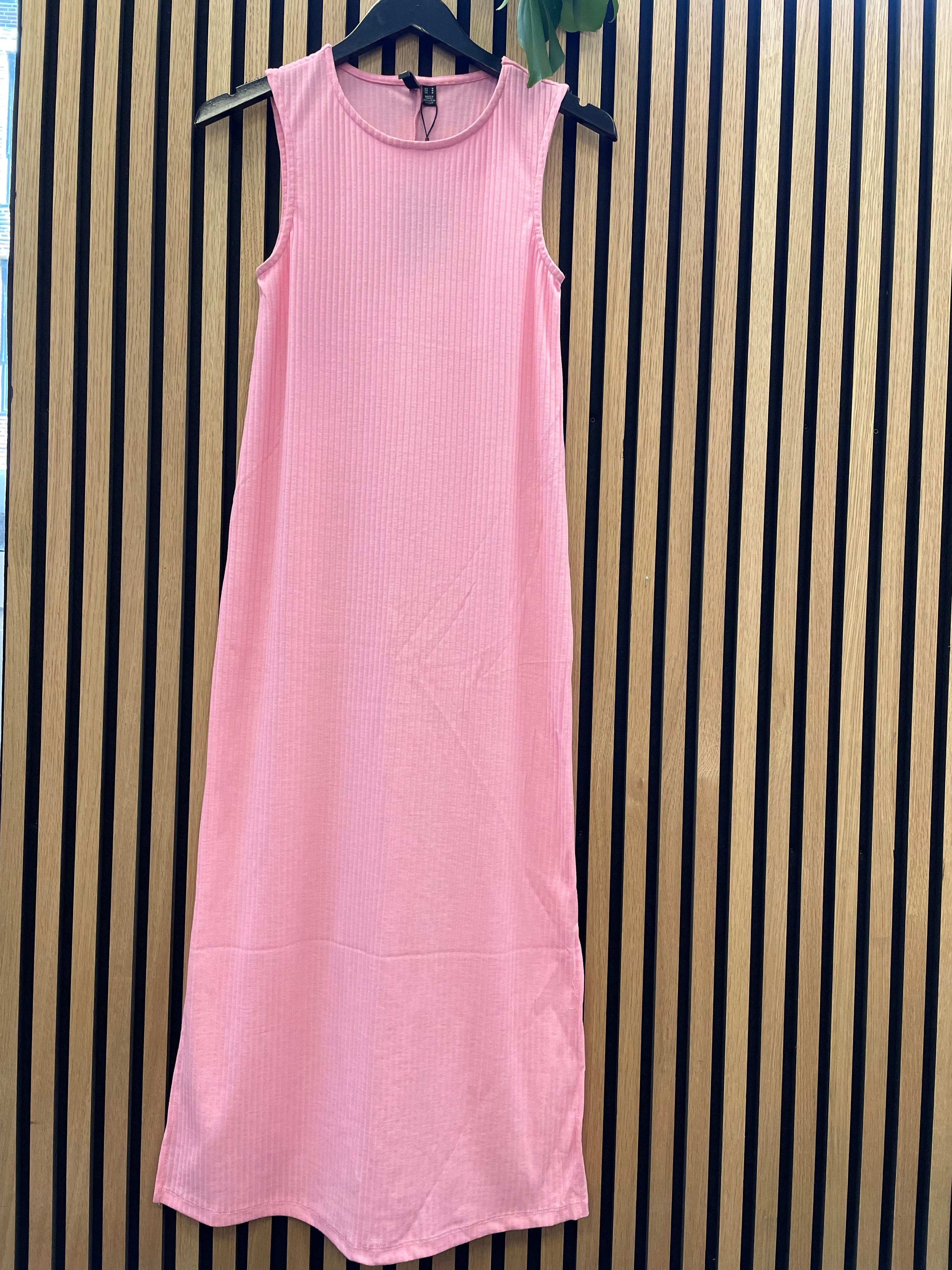 Cool midi kjole i rib materiale fra Pieces. Kjolen er uden ærmer, med rund hals og har slids i begge sider.