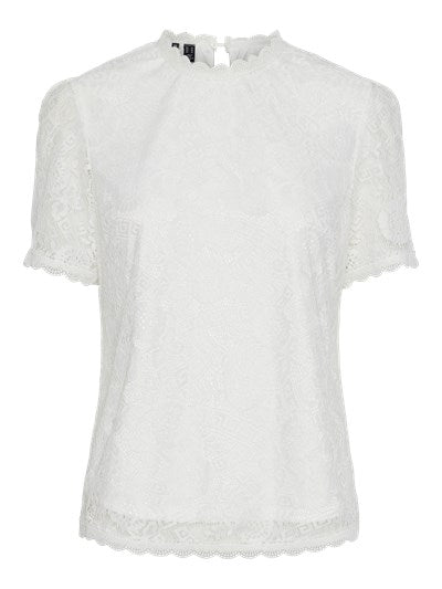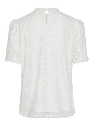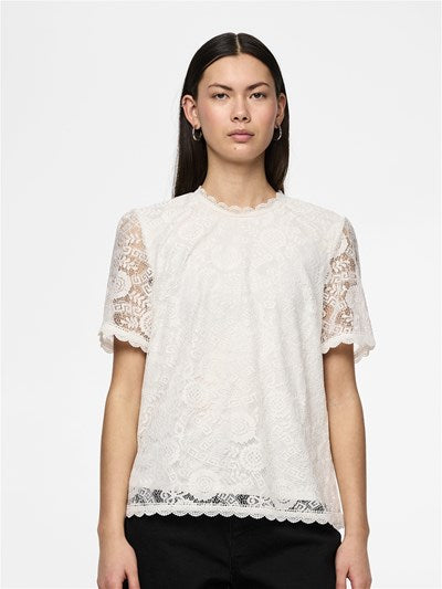 Så er den skønne klassiker fra Pieces tilbage. Olline toppen, nu med lille ærme og det smukke blonde mønster. Blusen har finde afslutninger ved ærme og halsudskæring.