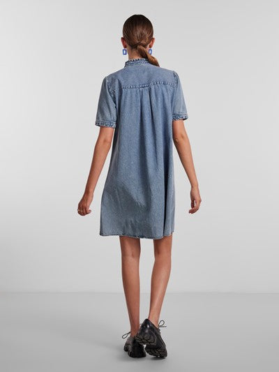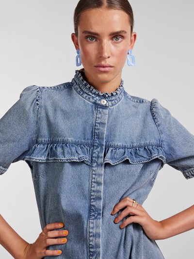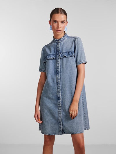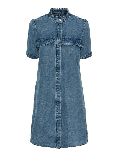 Cool denim dress fra danske Pieces. Kjolen har skjult knappelukning og flotte flæsedetaljer.
