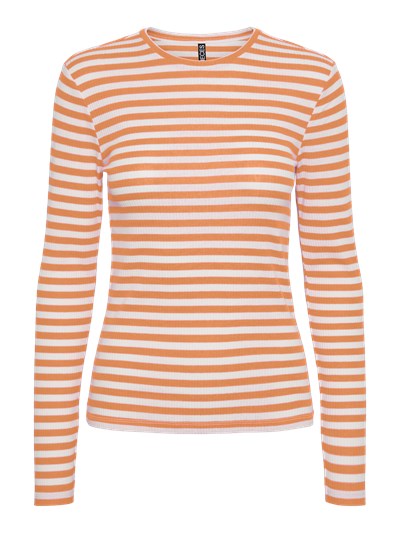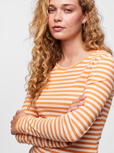 Super cool basis bluse fra danske Pieces i bomuld. Blusen er i en let tynd rib-kvalitet med masser af stretch og har den skønneste orange farve. Der er rund halsudskæring og lange ærmer.
