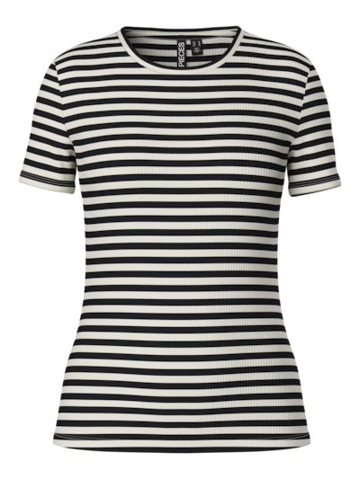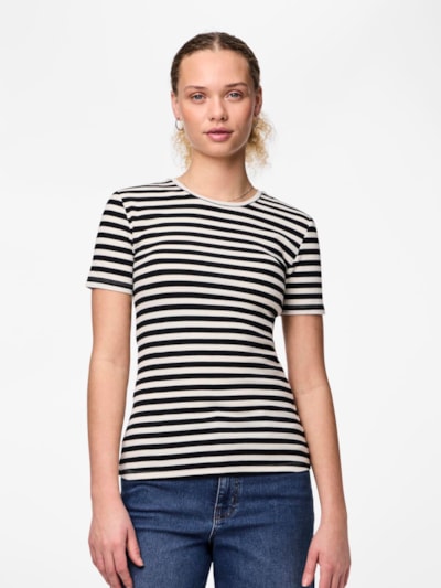 Super cool basis t-shirt fra danske Pieces i bomuld. T-shirten er i en let tynd rib-kvalitet med masser af stretch. Der er rund halsudskæring og korte ærmer.