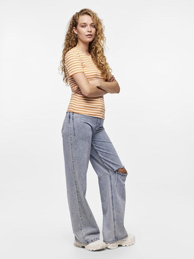 Super cool basis t-shirt fra danske Pieces i bomuld. T-shirten er i en let tynd rib-kvalitet med masser af stretch. Der er rund halsudskæring og korte ærmer.