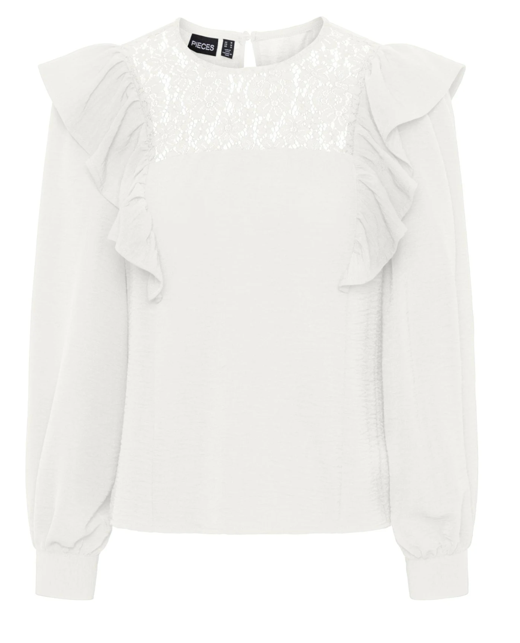 Skøn bluse fra Pieces i hvid. Blusen har rund halsudskæring med flot blondedetalje og flæse fortil. Blusen lukkes i nakken med knap.