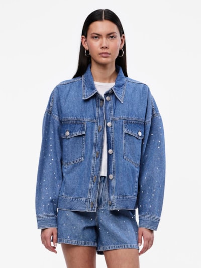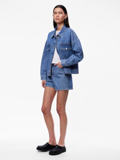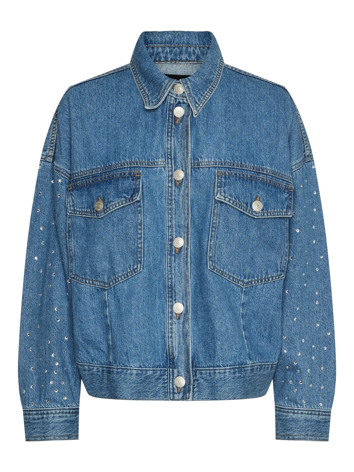 Top fed denimjakke fra Pieces med rhinesten. Jakken har en oversize pasform og er i en flot medium blue denim vask.