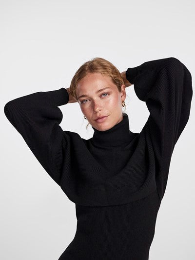 Cool rib-strikket kort pullover fra Pieces. Pulloveren har turtleneck, godt med stretch og passer perfekt til Sue kjolen fra pieces, som et sæt til de kolde aftner. Kommer i en bred løs pasform.