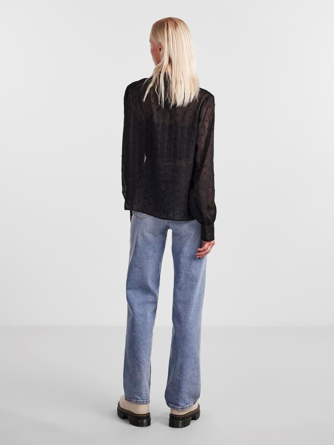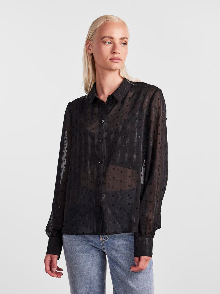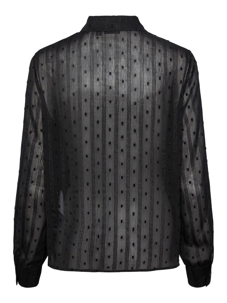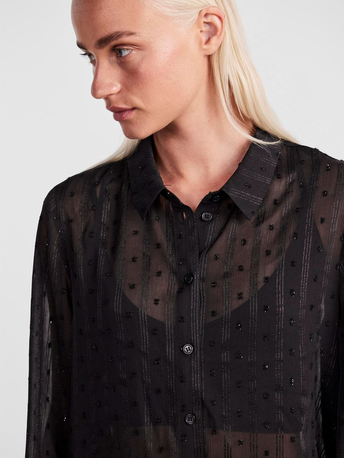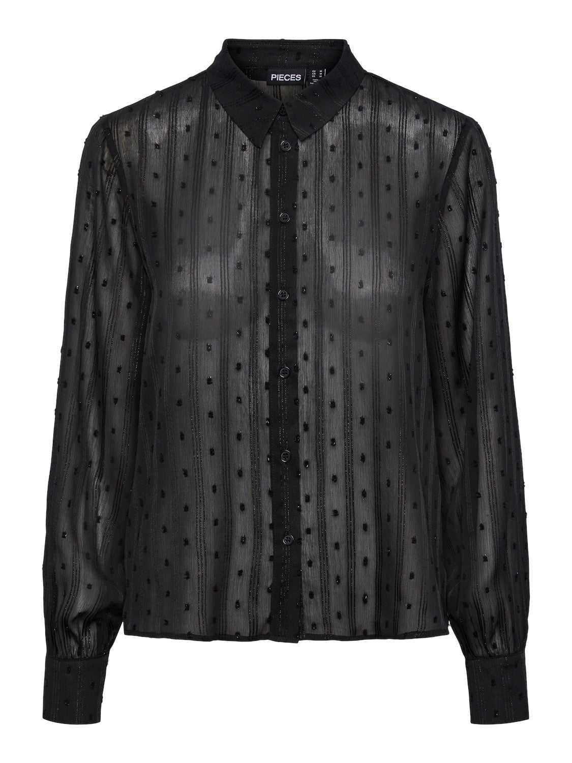 Skøn transparent bluse fra danske Pieces. Blusen har knappe lukning fortil og flot glimmer struktur.