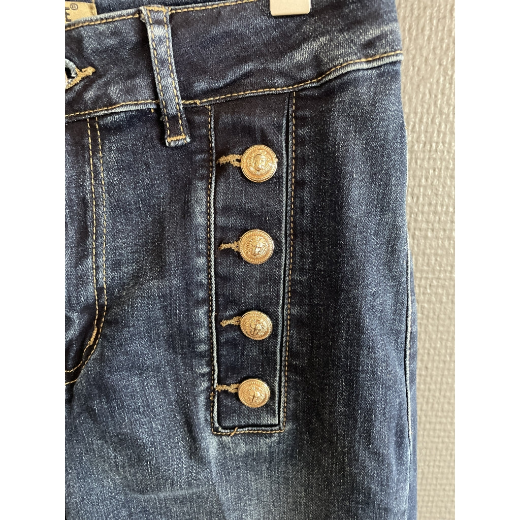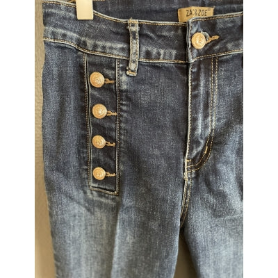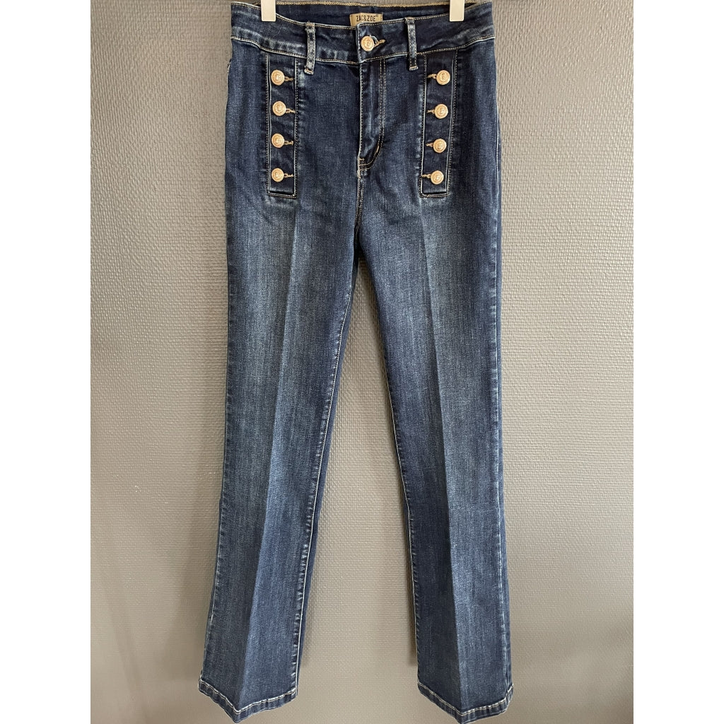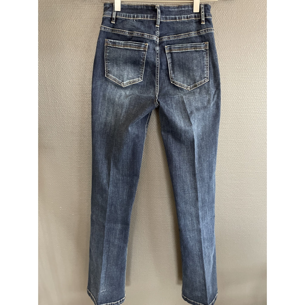 Skønneste jeans fra Qnuz i en flot mørkeblå vask. Jeansene har en høj talje, en slim fit pasform med flair i benene og flotte guldknapper fortil. Bukserne har godt med stretch.