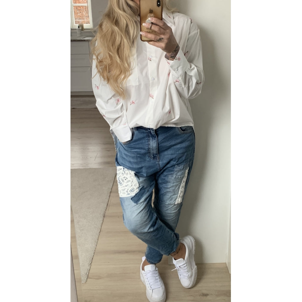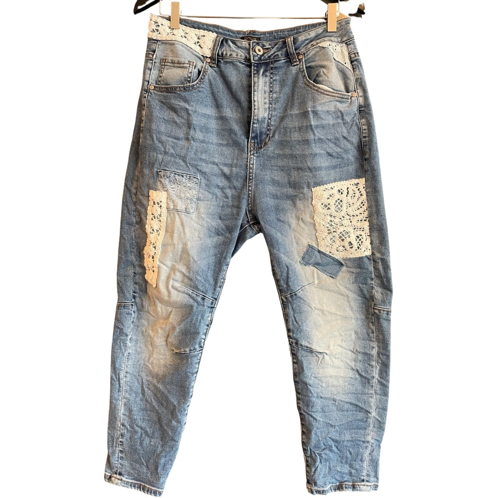 Super cool baggy jeans fra Qnuz i en flot denim blå vask. Jenasene har fede hvide blondedetaljer og en fed pasform. GÅ ET NUMMER NED !