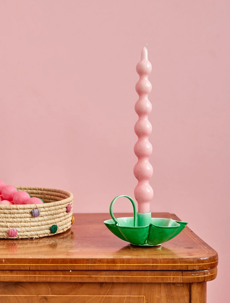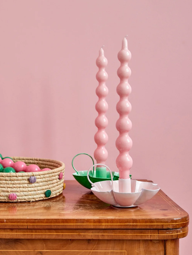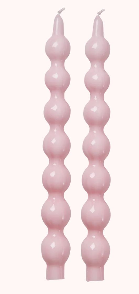 Det fineste sæt af to lyserøde lys i et unikt design… de tilføjer et strejf af farve og en varm, indbydende glød til dit hjem. Med en brændetid på 10 timer er de perfekte til de hyggelige aftener derhjemme! Deres charmerende kurver kan forårsage lidt løbende stearin, men det synes vi bare, er en del af deres charme.Størrelsesdata