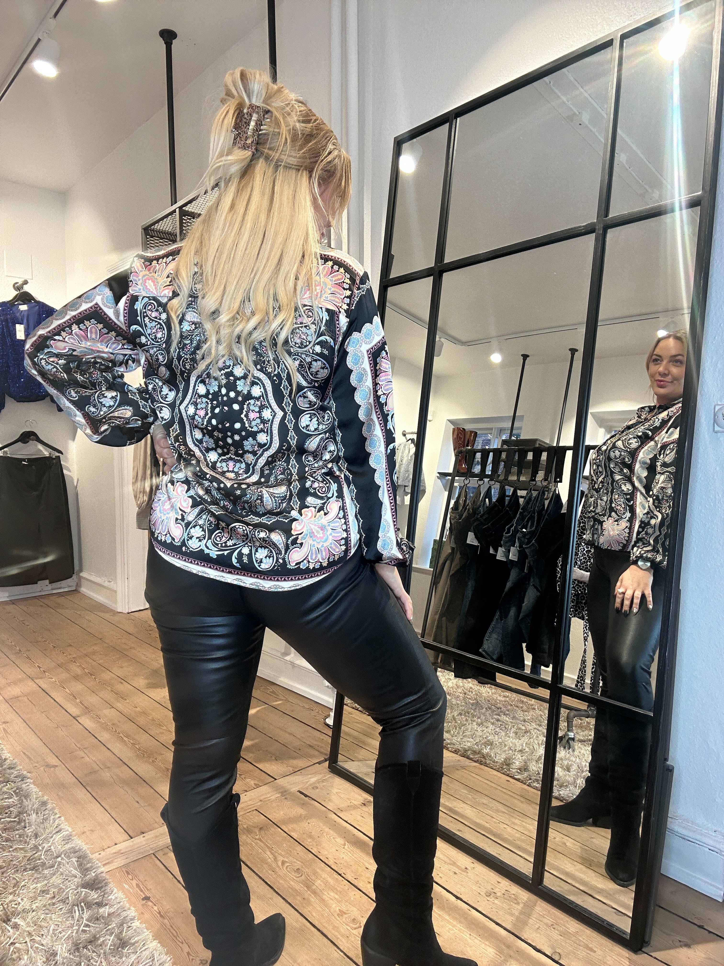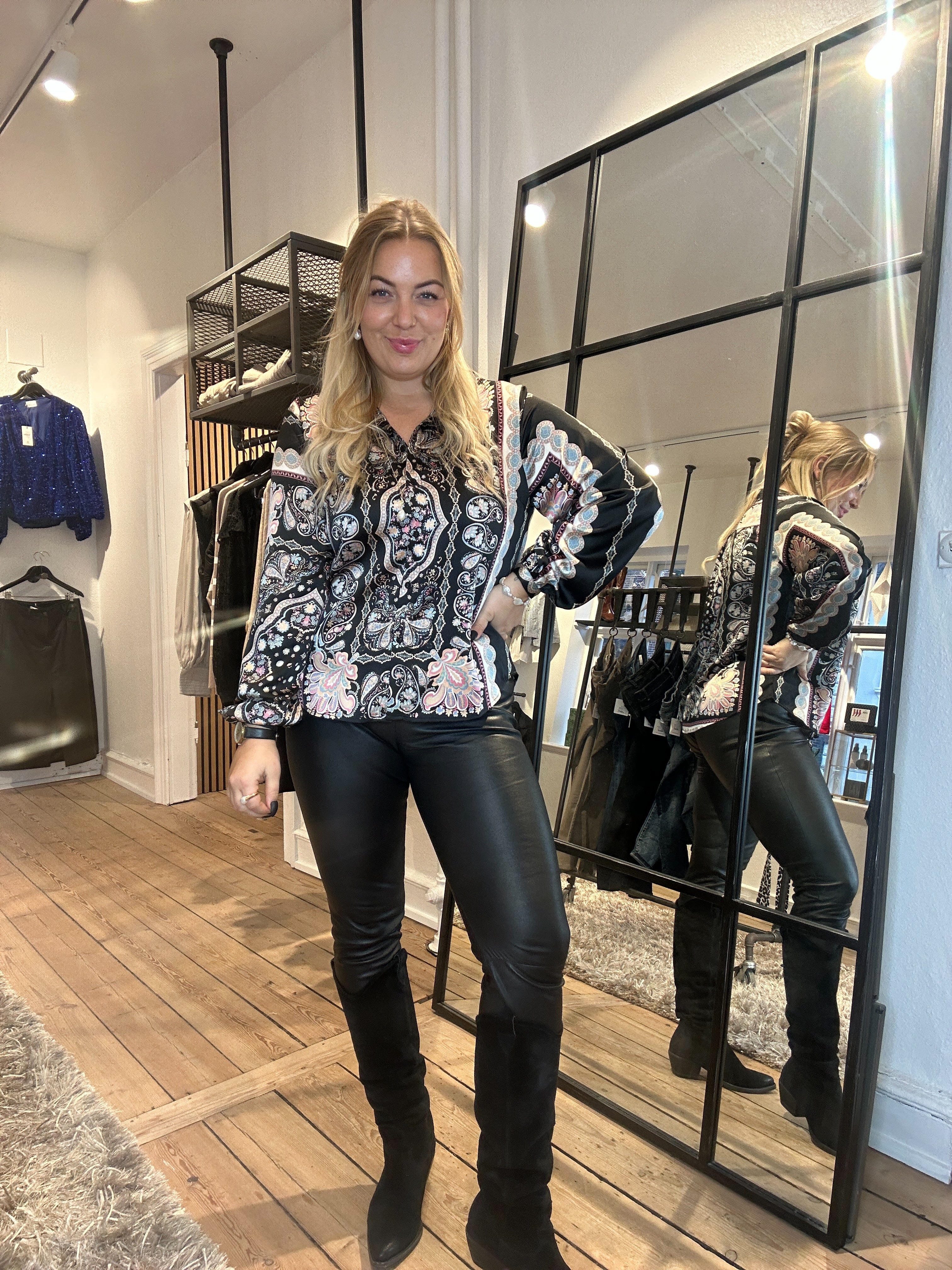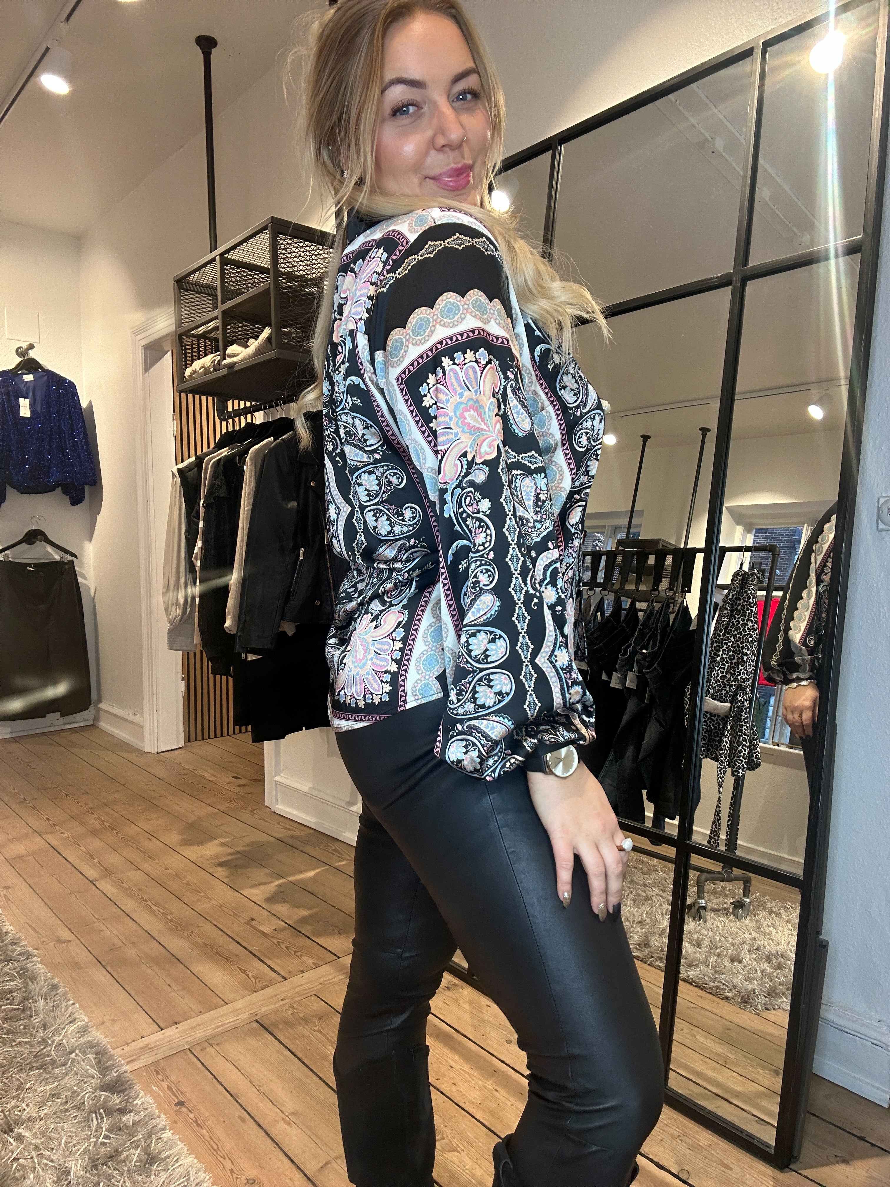 Super smuk bluse fra Sisters Point i et flot paisley mønster. Blusen har krave og lange ærmer og kommer i en lækker kvalitet.