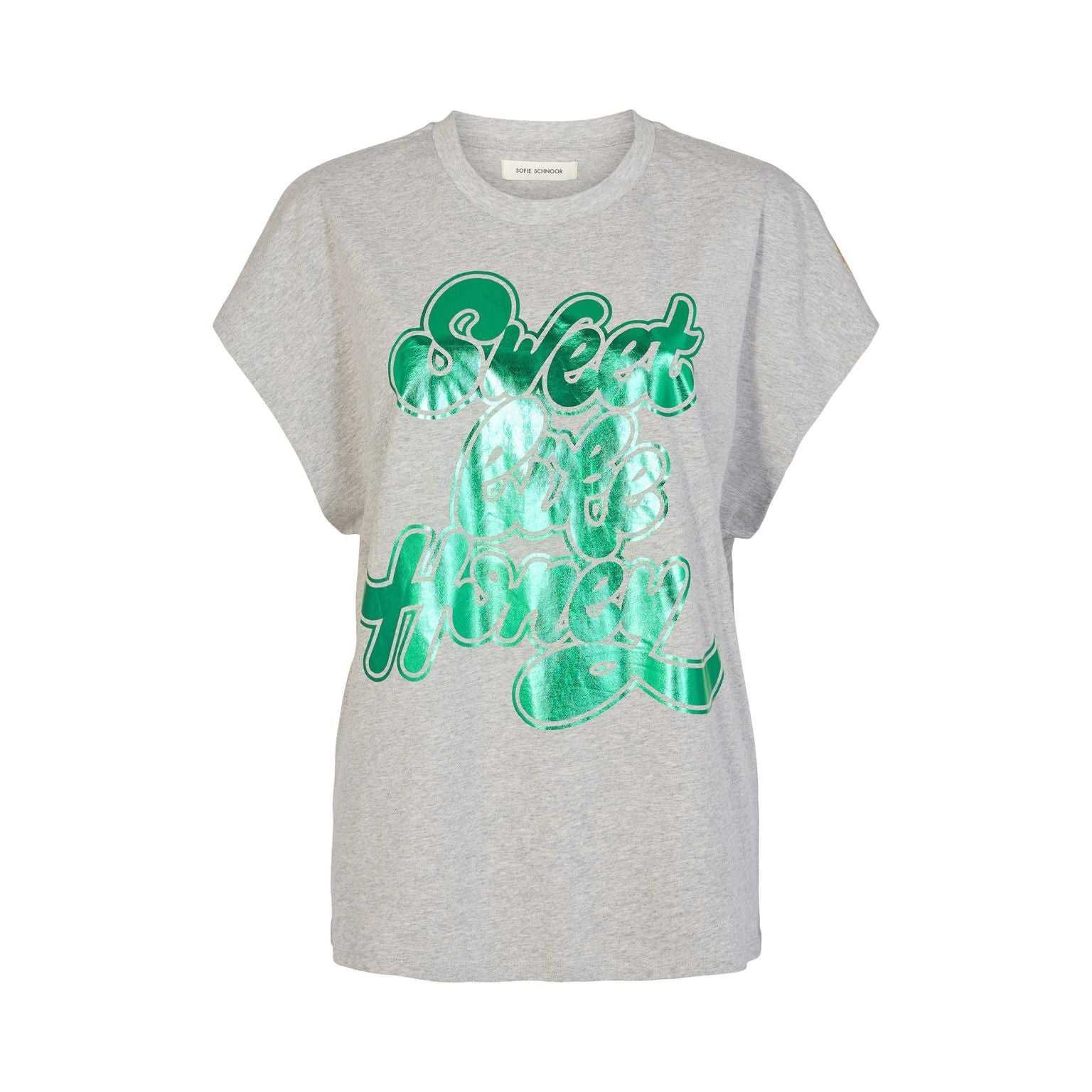 Cool T-shirt fra Sofie Schnoor med brede ærmeudskæring og nice grøn tryk. T-shirten har en oversize pasform.