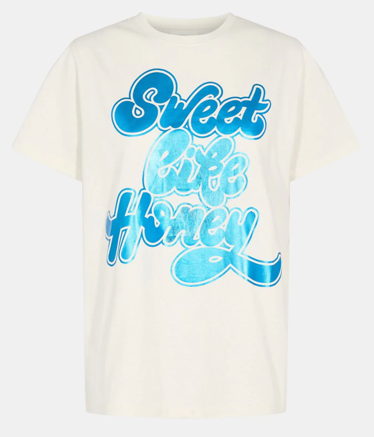 Lækker simpel t-shirt fra Sofie Schnoor i off white med blåt print på midten.
