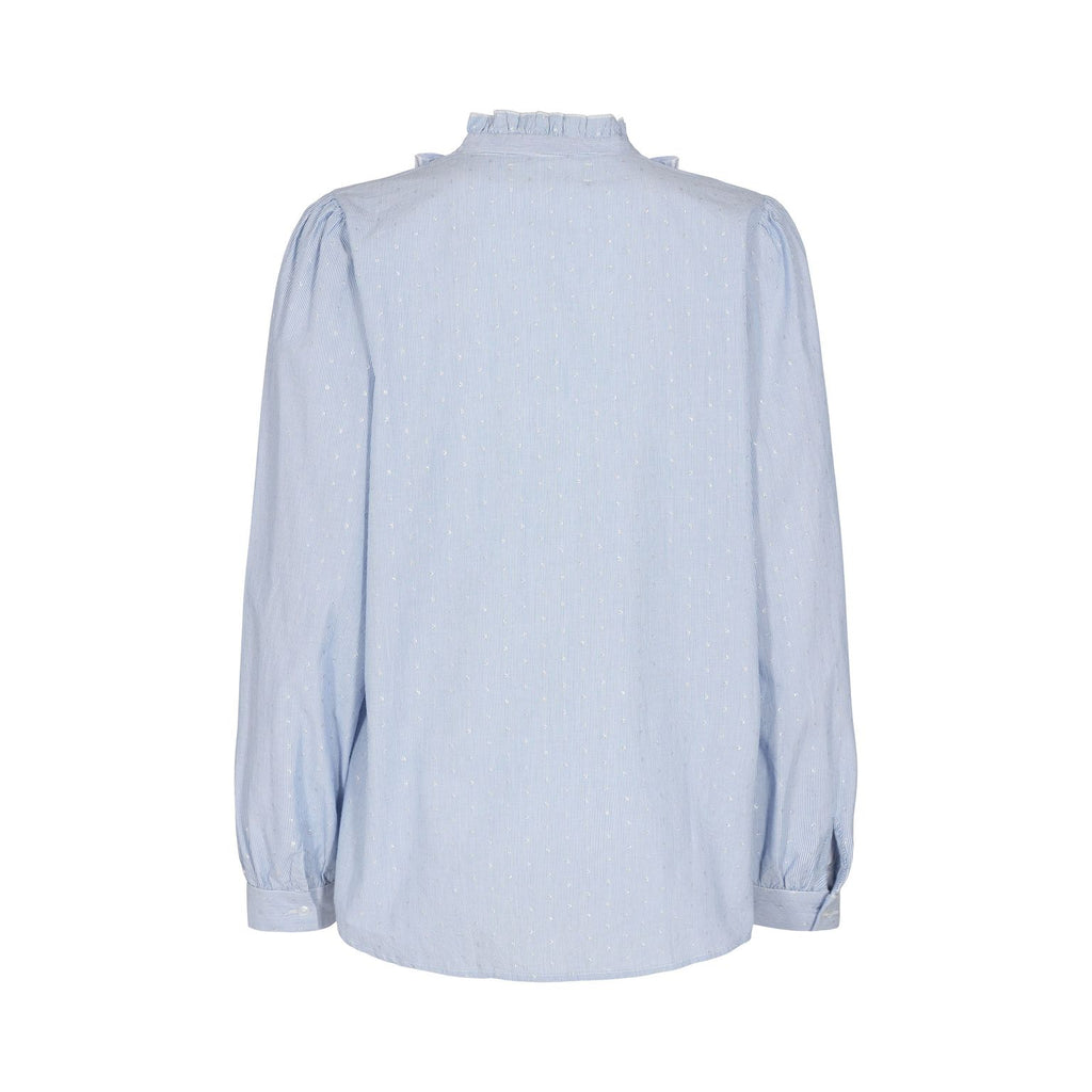 Smuk bomuldsbluse fra danske Sofie Schnoor. Blusen har stolpelukning fortil med v-udskæring og flæsedetaljer. I et skønt hvidt og lyseblåt strip med sølvnister.