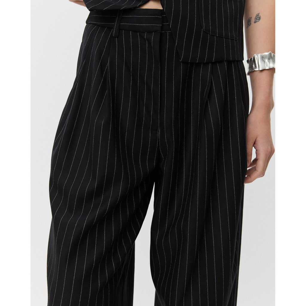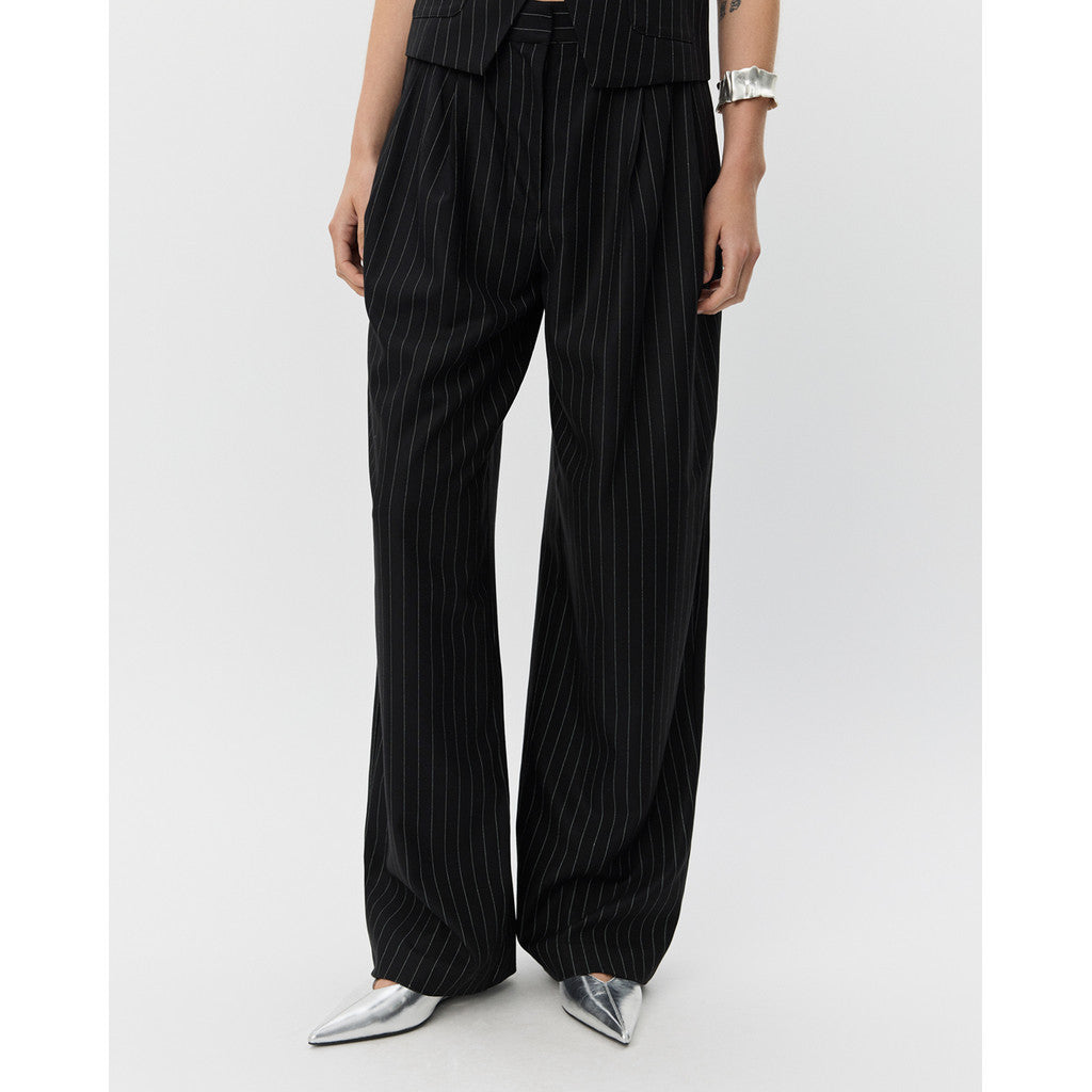 Klassiske habitbukser i nålestrib med en super lækker pasform. Buksen fra Sofie Schnoor har en høj talje, vidde i benene og læg fortil, som gør at den falder flot ned om kroppen. Derudover har buksen lommer foran og paspolerede lommer bagpå, samt bæltestropper.