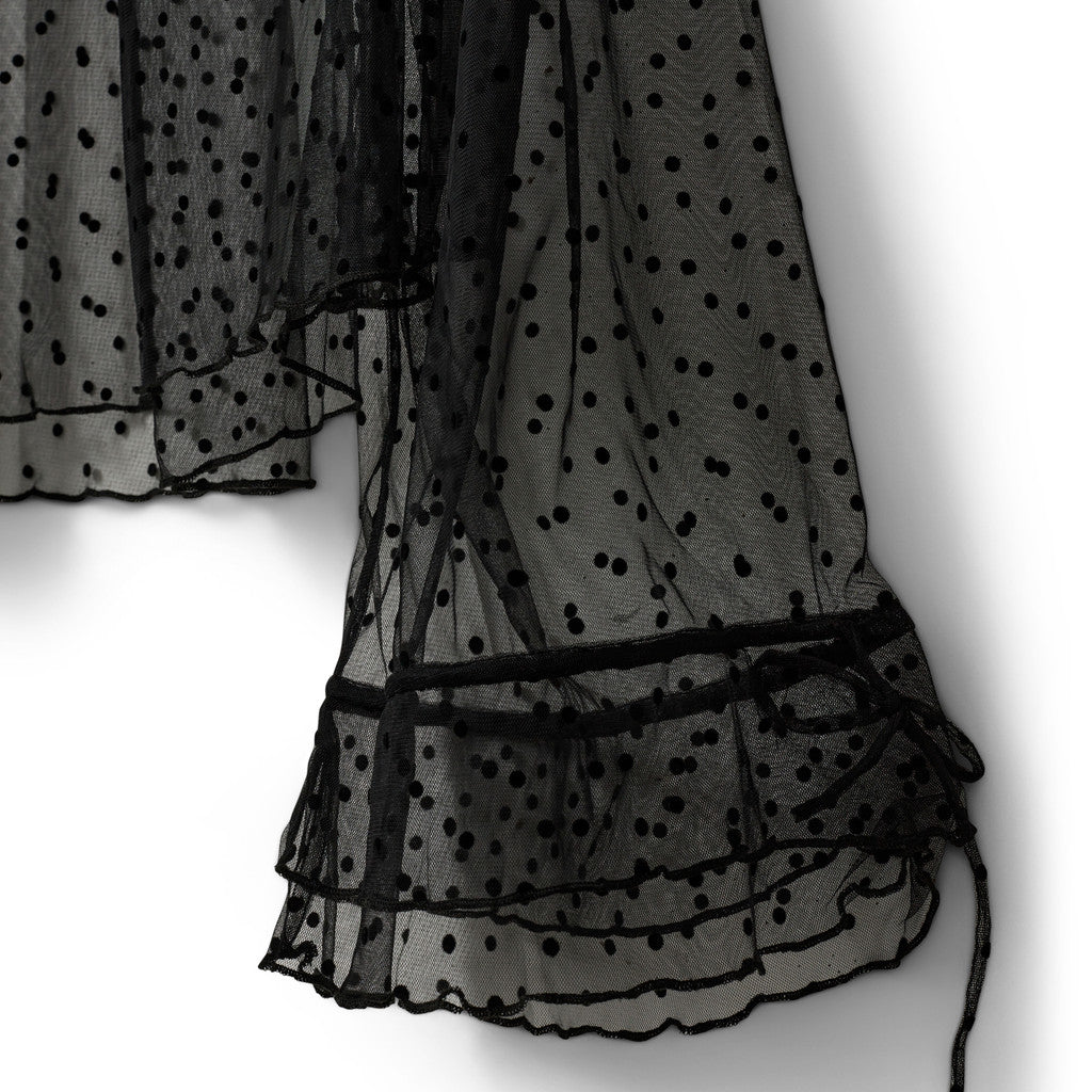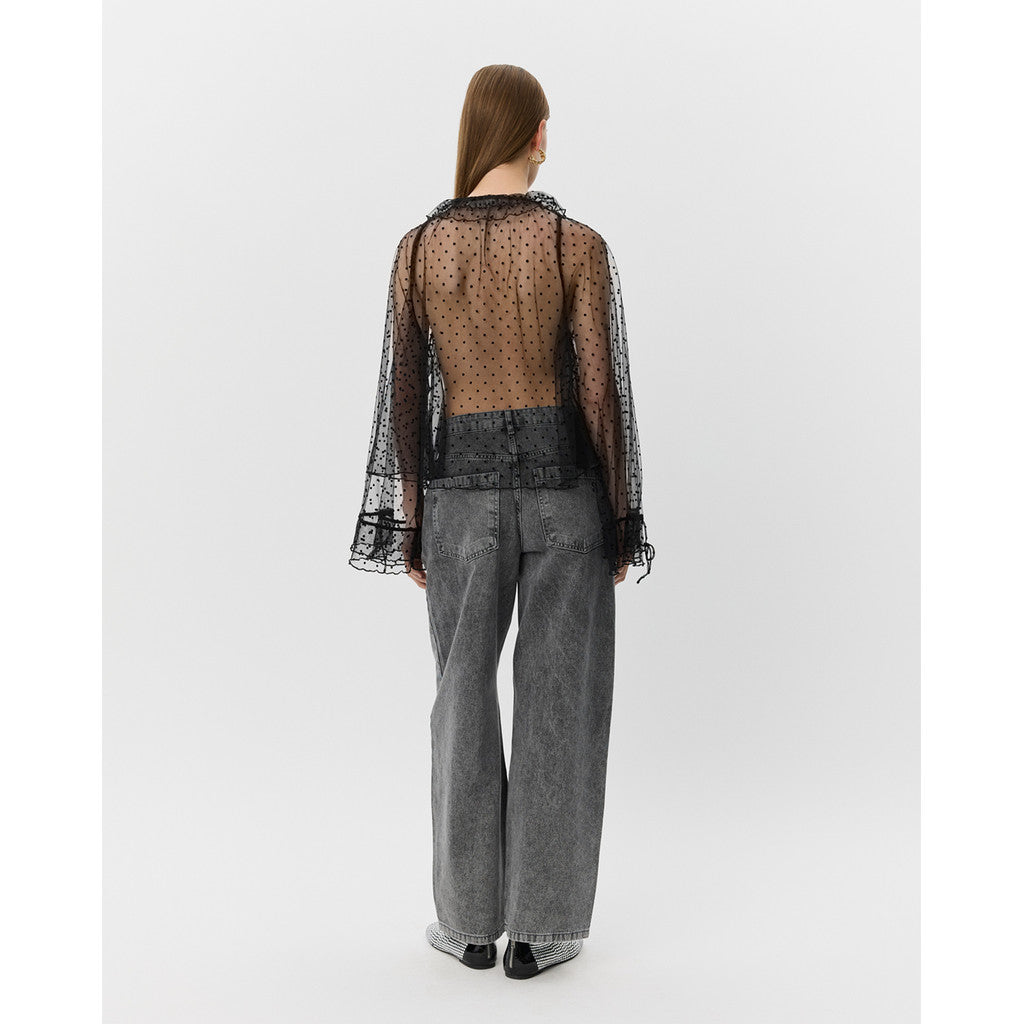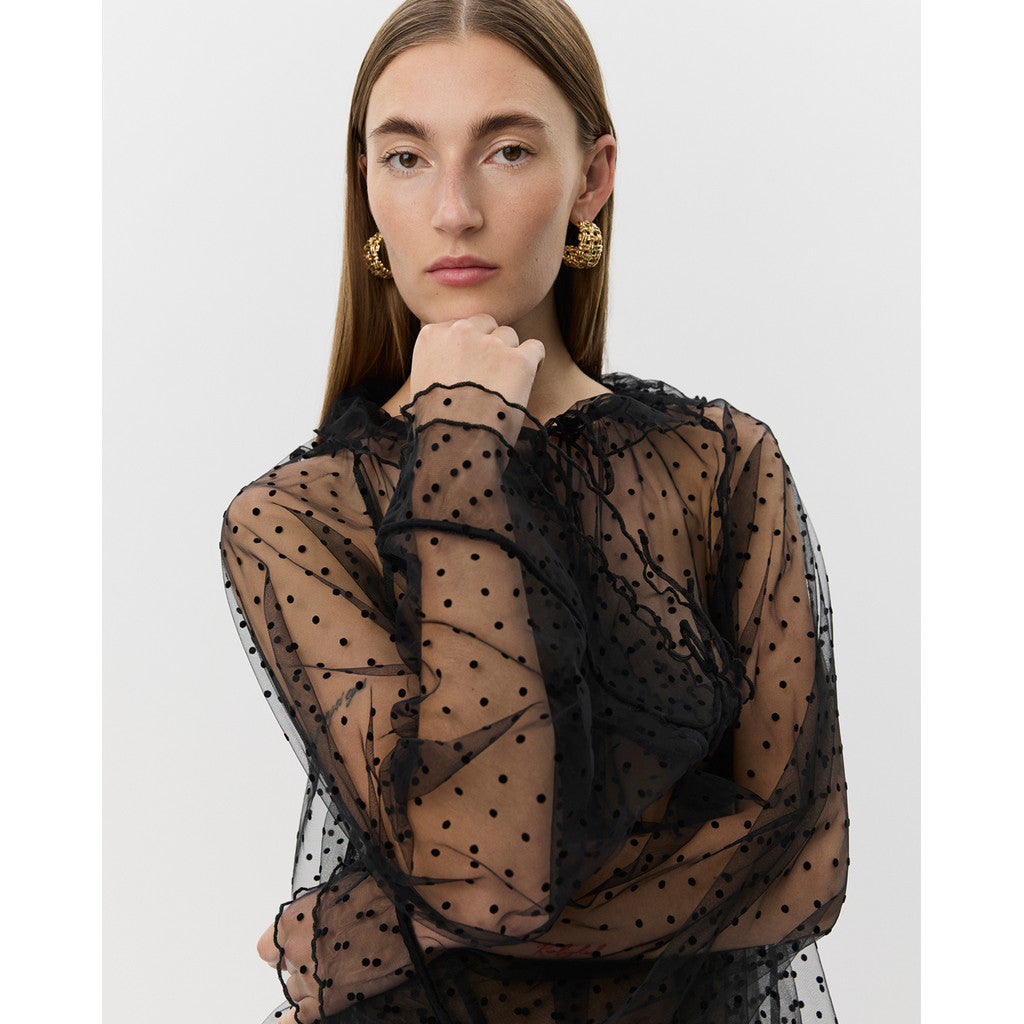 Super smuk transparent bluse fra Sofie Schnoor med polkaprikker. Blusen har rund hals med en lille flæse og snøredetalje, en løs pasform og vidde i ærmerne med mulighed for at snøre ind rundt om håndledet.