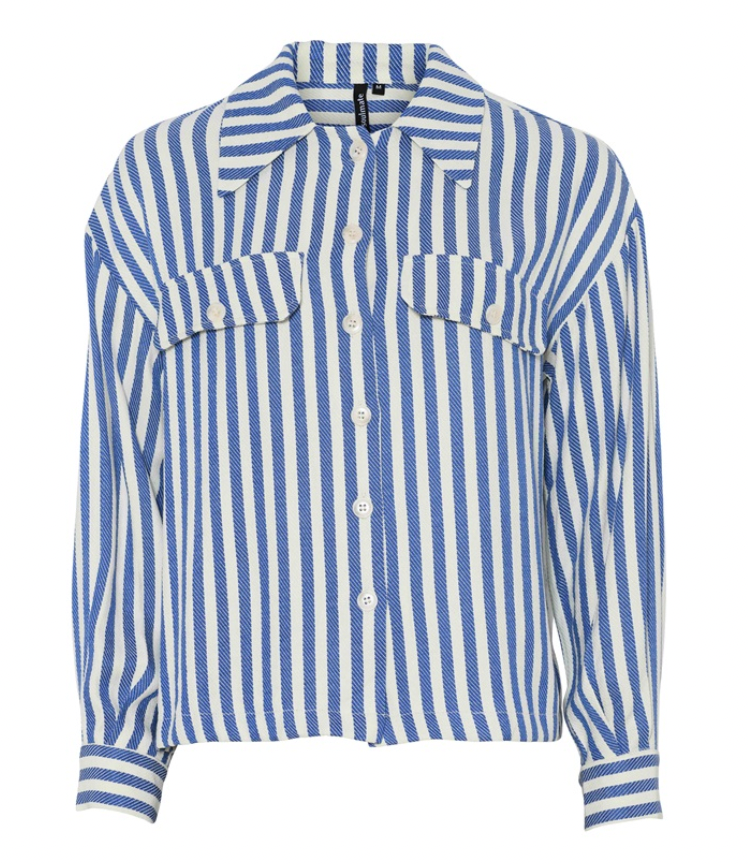 Cool skjorte fra Soulmate i off white og blå stribet mønster. Skjorten har krave og knaplukning. Derudover lange ærmer og brystlommer.