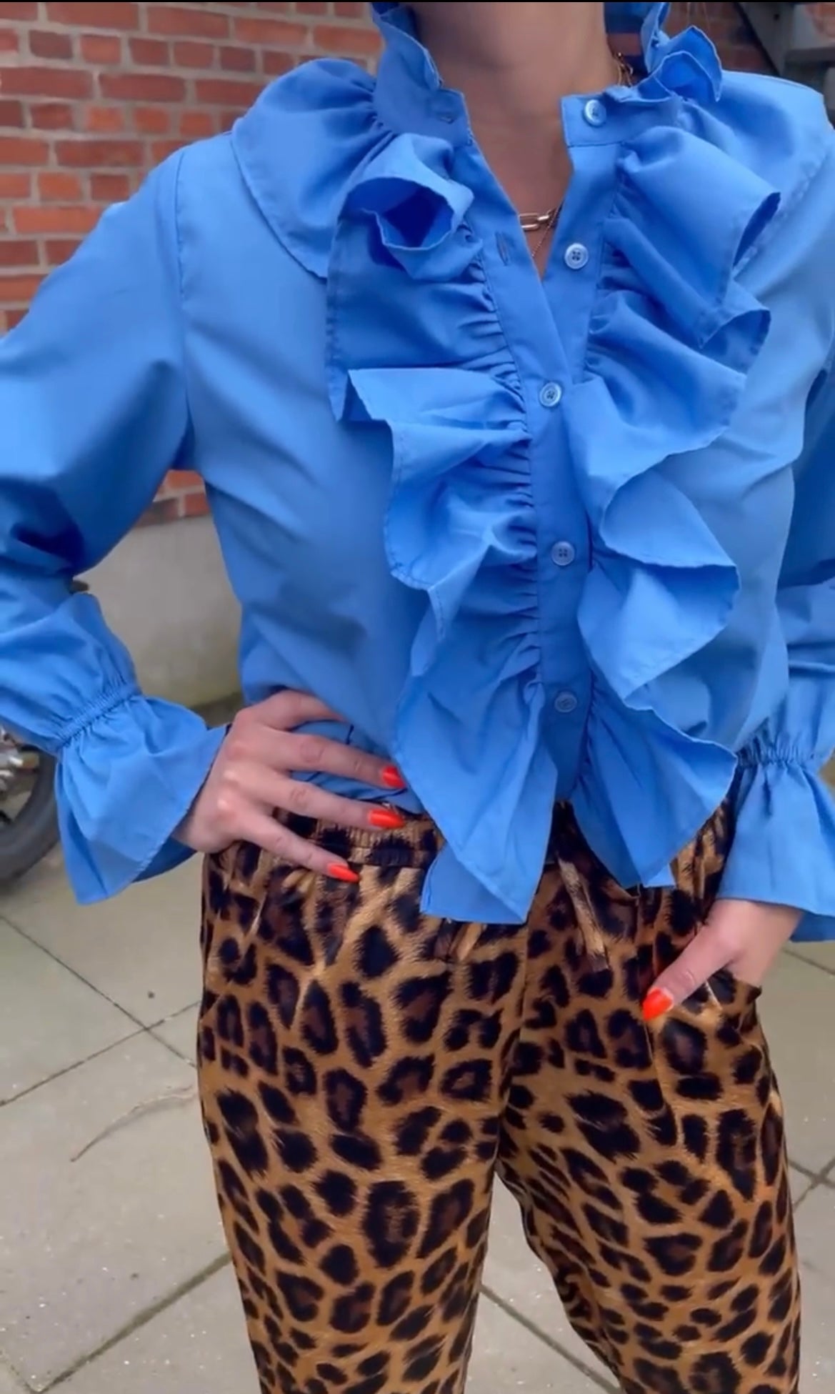 Smuk blå skjorte fra Stars By P i krølfrit bomuld. Skjorten har smuk flæsedetalje ned langs knappelukningen fortil.
