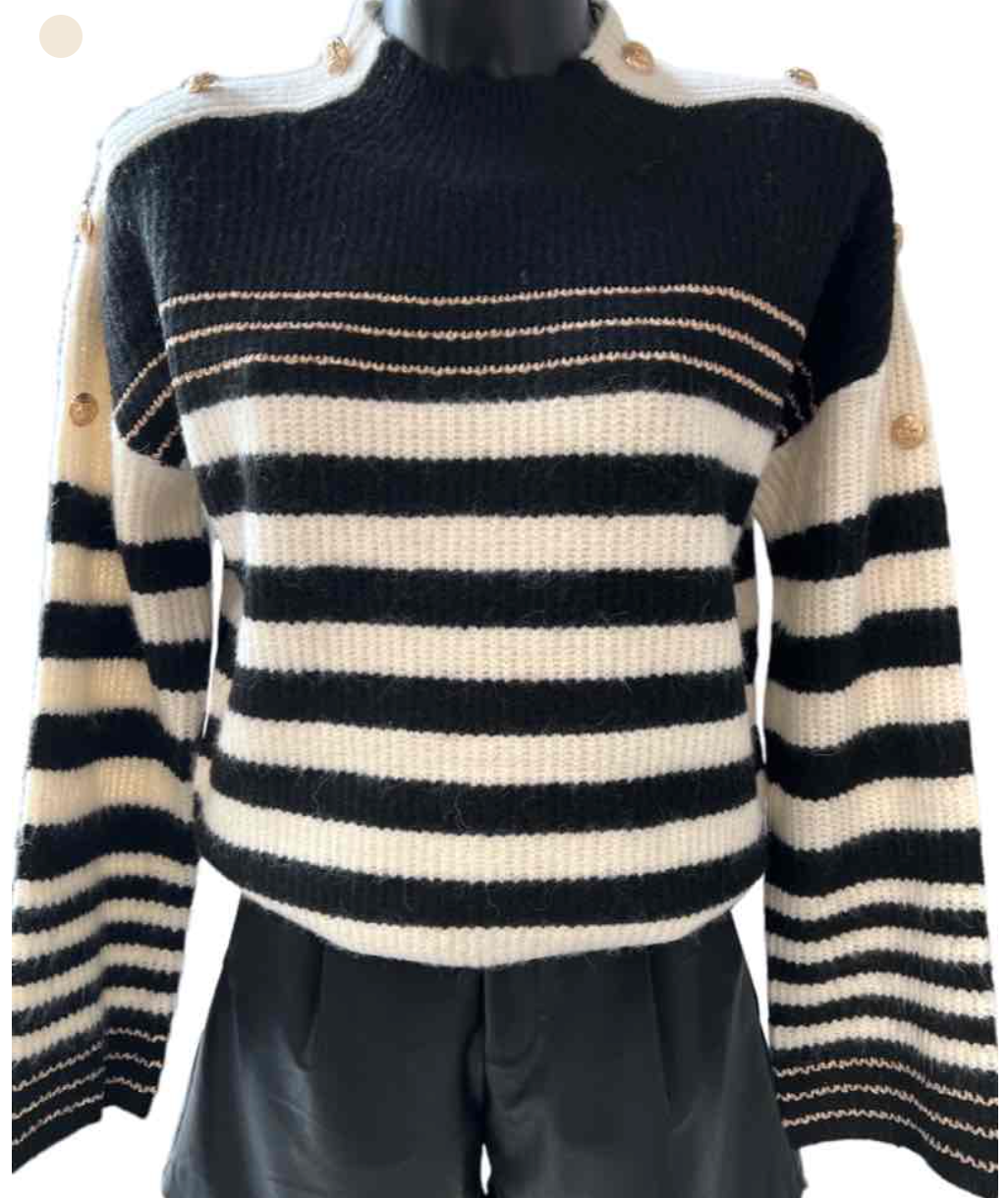 Cool strik i sort og hvid striber fra vores nye brand. Strikken har høj hals, let vidde i ærmerne og flotte gulddetaljer i form af lurex og guldknapper. Passer str small til xl