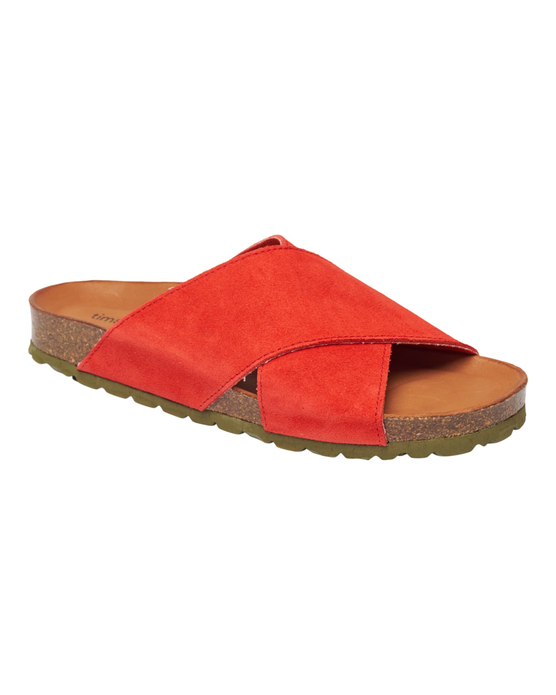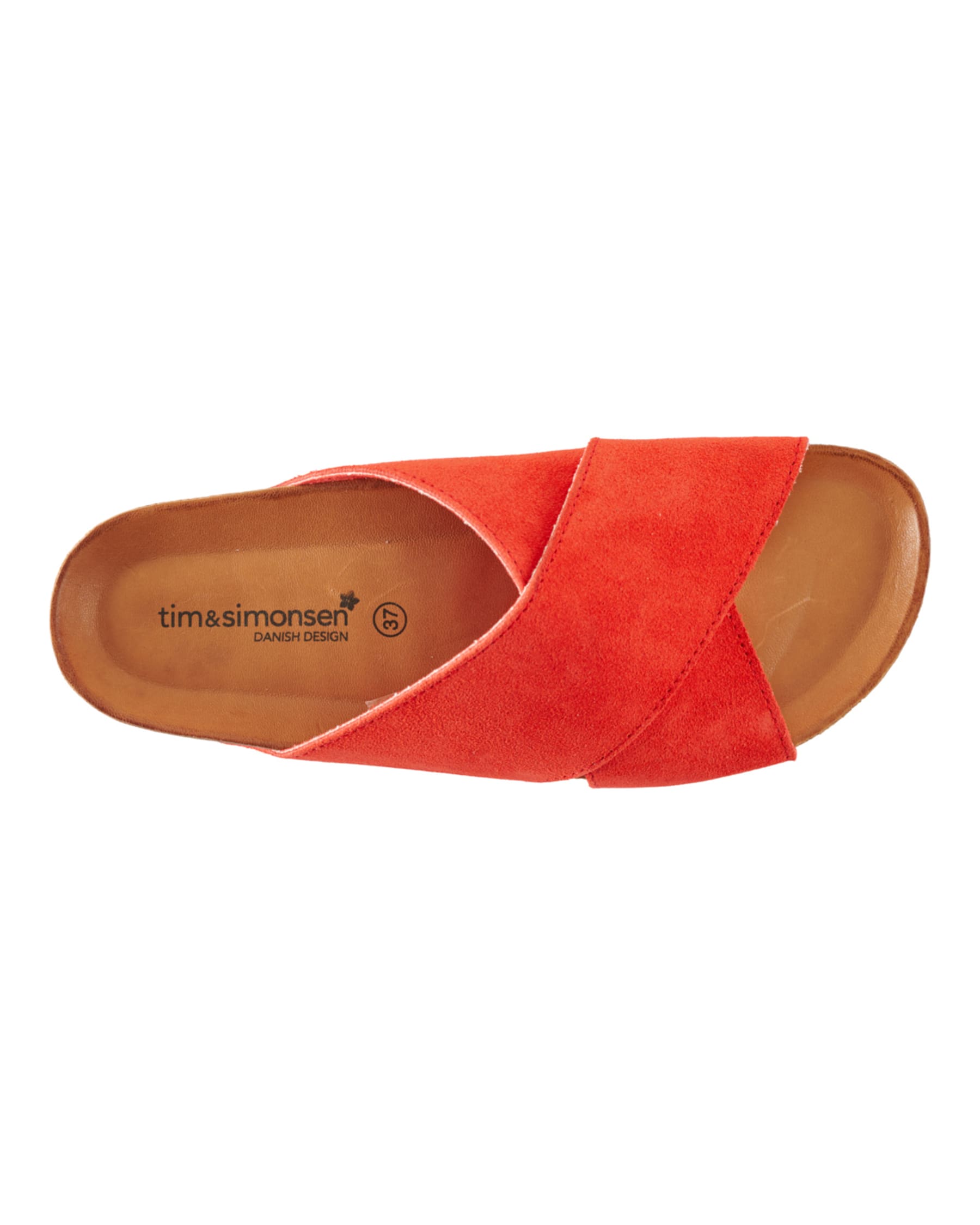 Lækker sandal fra Tim og Simonsen i den fineste røde farve og med grøn bund. Sandalen er lavet med memory skum, som gør den rigtig behagelig at have på.