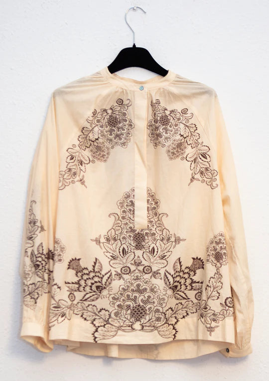 Smuk bomuldsbluse fra Wiesneck i pink og brun. Blusen har stolpe lukning og krave med flæsedetalje.