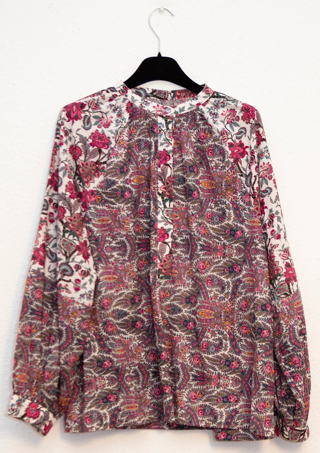 Smuk bomuldsbluse fra Wiesneck i pink og brune nuancer. Blusen har stolpe lukning og kommer i en lækker kvalitet.